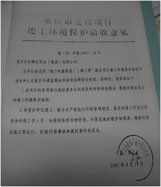 格力電器配套廠三期工程環境保護驗收意見